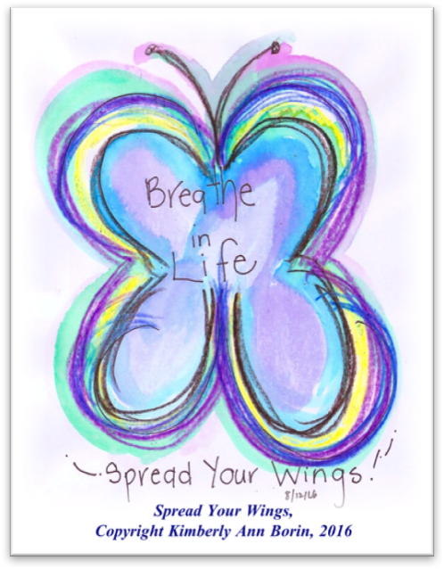 As I write this article, I am preparing for an art show called, Angels Waiting in the Wings.  I am surprised that at the culmination of my journey of discernment and The Gift Year, I am having an art show to share four feet tall angel wings! Last night, I went through my journals to see what I learned during the year, and for this essay too. I saw that on August 12th, 2016, I painted a simple butterfly, with the words, Breathe in Life, Spread Your Wings!